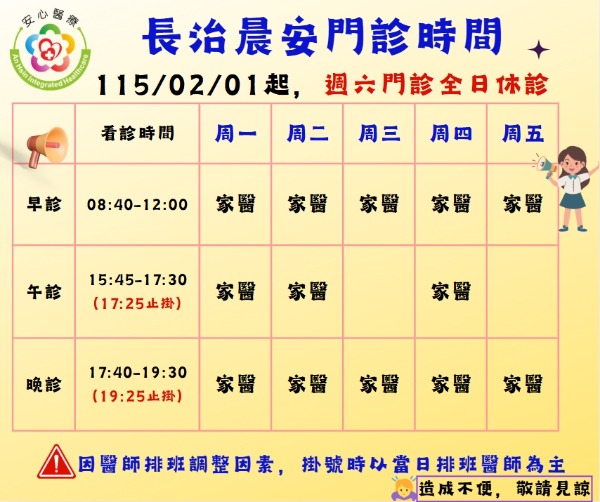 「長治晨安診所」正式成立! 我們的專業醫療團隊為鹽埔在地居民提供大人及兒童的急性病診療和三高慢性病個案管理等專業服務。 ● 智慧醫療系統 - 全自動掛號機 - App線上掛號系統 - 全自動包藥機